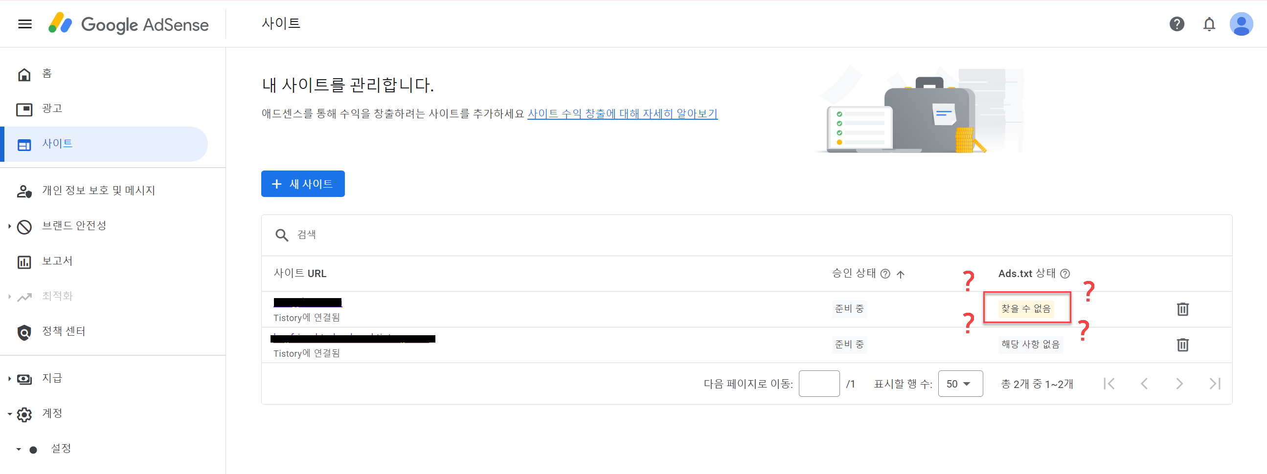티스토리 블로그를 만들고 나서 구글 애드센스를 등록하려고 새 사이트를 등록하면 아래와 같은 화면이 나올 때가 있다.첫 번째 사이트 URL은 직접 도메인을 사서 입력한 티스토리 페이지이고,두 번째 사이트 URL은 티스토리 도메인 그대로 등록한 경우이다. 이때 내가 직접 도메인을 구입해서 등록한 URL만 ads.txt 상태가 "찾을 수 없음"으로 나오는데, 이에 대한 해결 방법은 생각보다 간단하다. 참고) 이 문제를 반드시 해결해야 하나? 싶긴 할 거지만 일단 하는 것을 추천한다.ads.txt를 반드시 사용해야 하는 것은 아니지만, 사용을 적극 권장합니다. ads.txt 파일은 구매자가 가짜 인벤토리를 식별할 수 있게 도와주어 가짜 인벤토리에 광고비가 지출되지 않도록 해 주므로 광고주의 수익이 늘어날 수 있..
